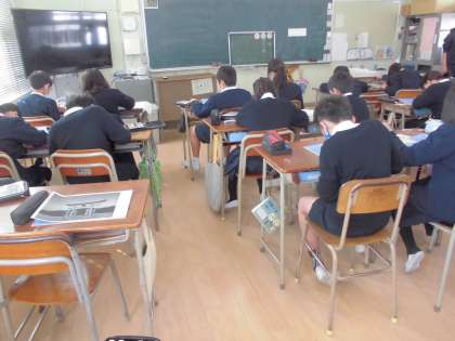 修学旅行の絵をかいて、彫刻刀で彫っていました。