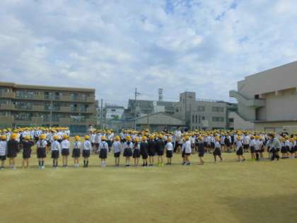 今日は一年生を迎える会を運動場で行いました。