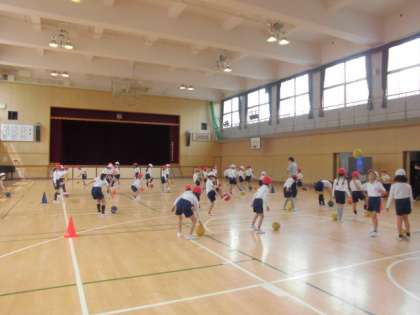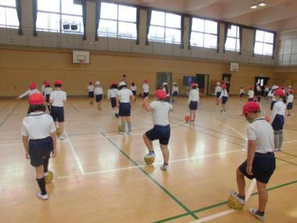 ボールを使って、音楽に合わせてボールタッチの練習です。
