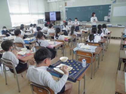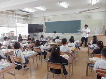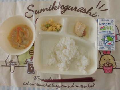 今日の「えんどうの卵とじ」のえんどうは、給食室でさやから豆を取り出して調理しています。
