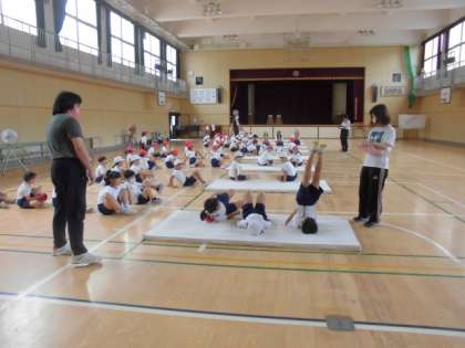 カエルの足打ちや三角支持など、逆さ感覚を感じ取れるように取り組んでいました。