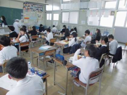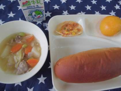 給食の変わりピザは、餃子の皮にツナ、コーン、ピザソース、チーズを混ぜ合わせた具をのせ、焼き物機で焼いています。子どもたちに大人気の献立の一つです。