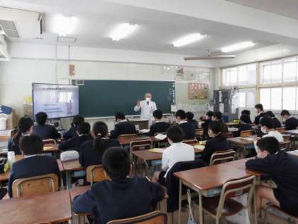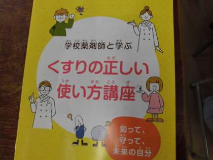 今日は、6年生は保健体育の学習で、薬剤師の先生を招いて、「くすりの正しい使い方講座」をしました。用法、用量を守って飲むことの大切さを学習しました。薬物についての学習もしました。