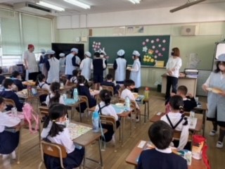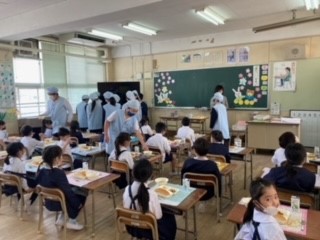 今日は1年生にとって初めての給食です。しばらくの間は6年生が配膳のお手伝いをしてくれます。