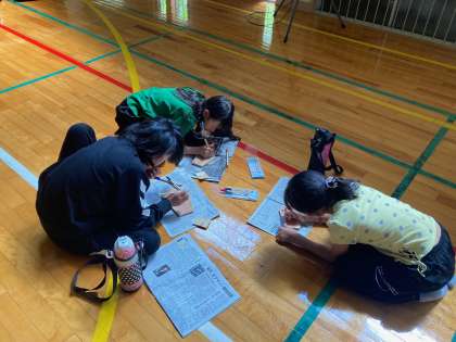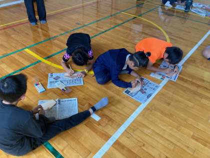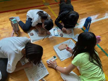 林間学習の思い出を絵馬にかいています。