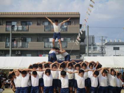 今年のテーマは「ヒーロー」。土台の子も、上に乗る子も一人一人がヒーローです。胸を張ってすばらしい組立体操が完成しました。