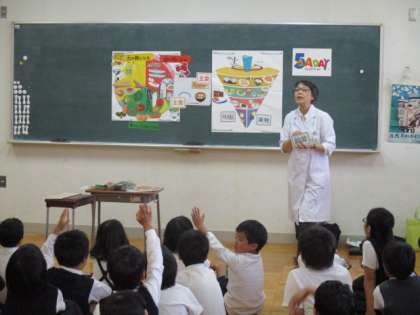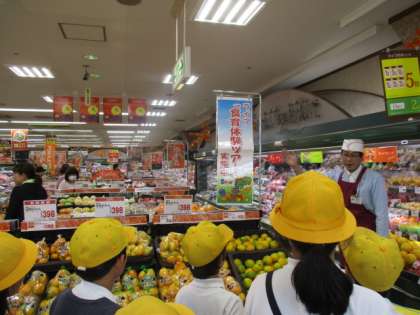 スーパーのライフから、食育インストラクターに来ていただき、三色食品群・食事バランスガイド・ファイブ・ア・デイについて教えていただき、いざ、ライフへ。学習したことを生かして買い物ゲーム。また、バックヤードの見学もさせていただきました。