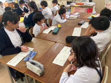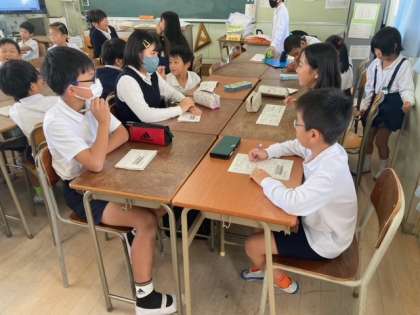 2時間目に全校遠足に向けてのたてわり班活動を行いました。1年生から6年生までのグループになり、行程の確認をしたり、班のめあてを決めたりしました。6年生が中心となりグループをまとめていました。