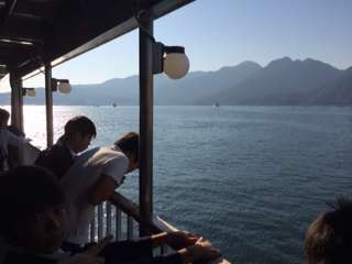 8時30分 フェリーで宮島に向かっています。みんな元気です。