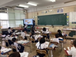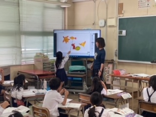 1年生が国語科で、どのような言葉を使うと話が楽しく繋がるのか学習しました。まず相手の話を受け止める、そして質問するなど話が楽しく繋がる言葉を考えました。