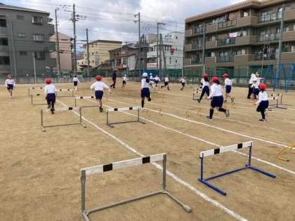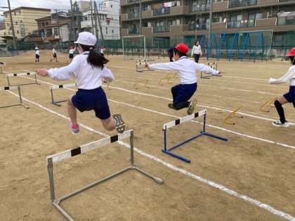 3年生が体育科でハードルの跳び方を学習しました。自分に合ったハードルの高さや間隔のコースを見つけて挑戦しました!