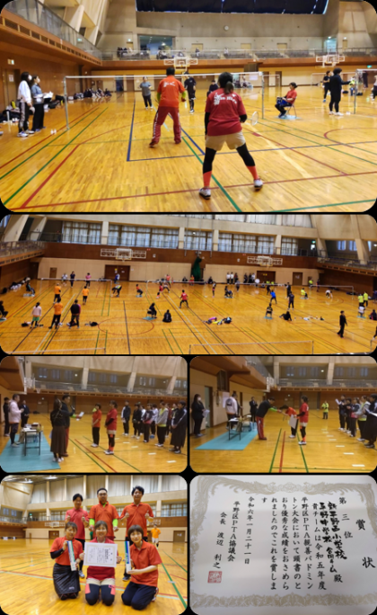 PTAバドミントン部は、新平野西小学校・平野中学校合同チームで参加しました。9校参加の中、3位になり表彰されました。
