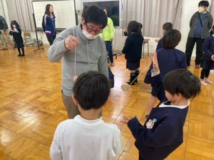 1年生が地域の方をゲストティーチャーに招いて、生活科「むかし遊び」を学習しました。
