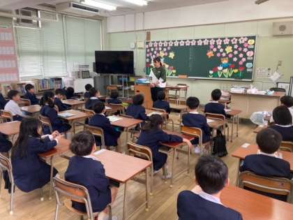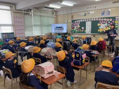 1年生の子どもたちが先生から学校生活についての話を聞いていました。緊張感もほぐれて楽しそうに友だちと話す姿も見られました。