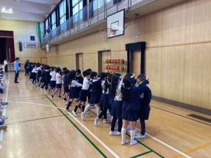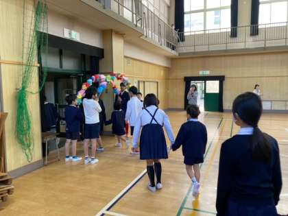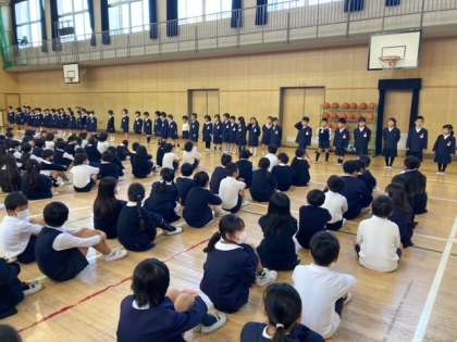 今日は全校児童が集まって1年生を迎える会を行いました。2年生からお祝いのペンダントをプレゼントしてもらい1年生のみなさんはとても嬉しそうでした。これから、地区班やたてわり班でも協力して活動してほしいです。