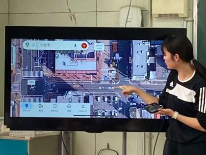 グーグルマップで校区の様子を大型モニターに提示し、クラスみんなで気づいたことを発表しました。