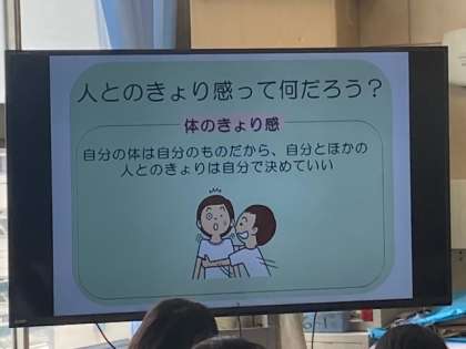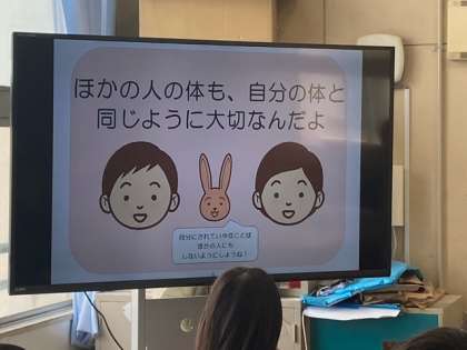6年生が「いのちの安全教育」について学びました。養護教諭からプライベートゾーンや、人との距離感について話がありました。他の人の体も自分の体と同じように大切、体やこころの距離感は人それぞれ違うことなど学習しました。