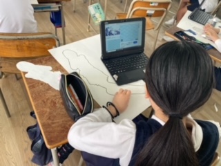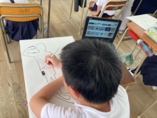 5年生が図画工作科の時間に、線描をつかって自分の影を描きました。タブレットで線描のデザインを調べながら描いていきました。