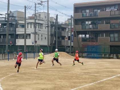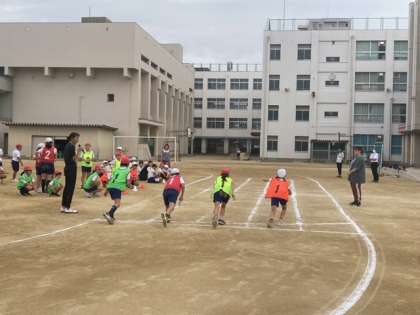 今日は5年生がトップアスリート夢授業で陸上競技の選手を招いて、短距離の走り方を教えていただきました。早く走るための手の振り方や脚の蹴り方を教えていただき実践しました。