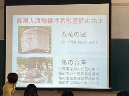 今日はソンセンニムを招いて6年生がサラム実践を行いました。韓国人原爆犠牲者慰霊碑についてお話していただきました。
