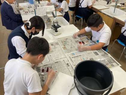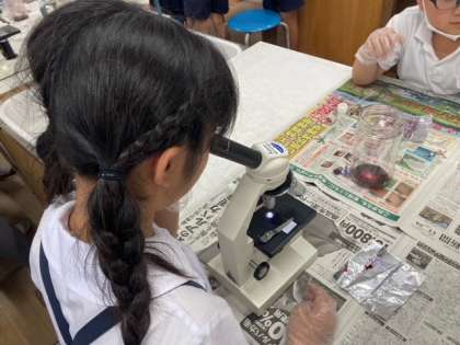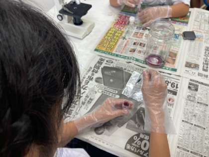 病気とたたかう体の仕組みについて、病原体や体のバリアについて説明を聞き、病気の組織を調べる染色を体験しました。