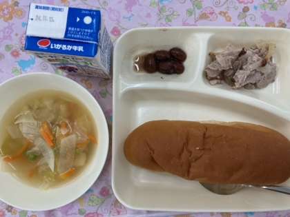 今日の献立は、豚肉のバジル焼き、スープ、うずら豆のグラッセです。