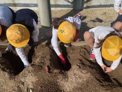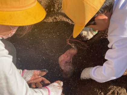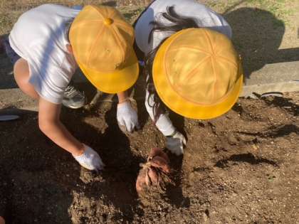 13日に2年生が学習園に植えたさつまいもの収穫をしました。「わあ、めっちゃ大きい」という歓声があちらこちらから聞こえてきました(^^)