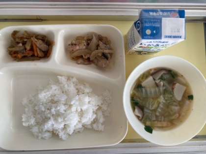 今日の献立は、鶏肉の梅風味焼き、うすくず汁、きんぴらごぼうです。