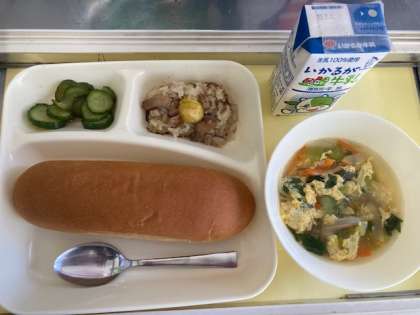今日の献立は、中華おこわ、卵スープ、きゅうりのピリ辛和えです。