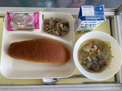 今日の献立は、豚肉と野菜のソテー、スープ、スイートポテトです。