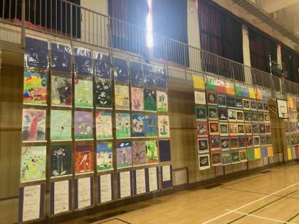 16日から19日までの個人懇談会期間中、講堂に全校児童の絵画作品を展示しています。