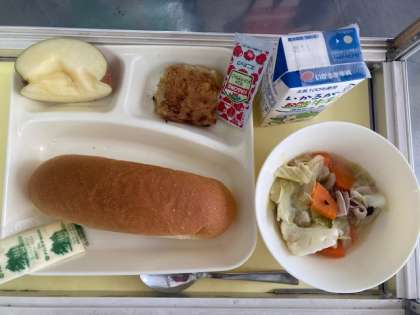 今日の献立は、とうふローフ、カリフラワーのスープ煮、りんご、ソフトマーガリンです。