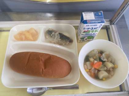 今日の献立は、あじのレモンマリネ、てぼ豆のスープ煮、白桃缶です。