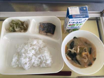 今日の献立は、さごしの醤油だれかけ、みそ汁、キャベツの赤じそ和えです。