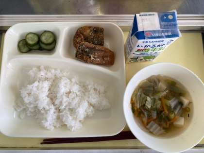 今日の献立は、さばのカレー竜田揚げ、五目汁、きゅうりの甘酢和えです。