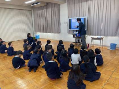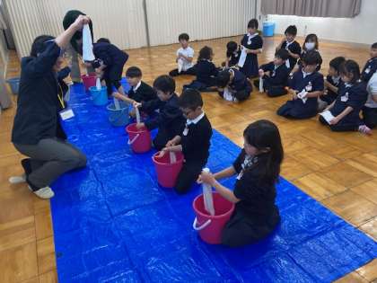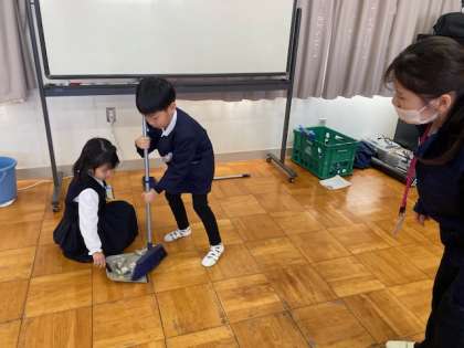 今日は1年生の児童を対象に、ダスキンから出前授業に来ていただきました。ほうきの使い方や、雑巾の絞り方などを教えていただきました。
