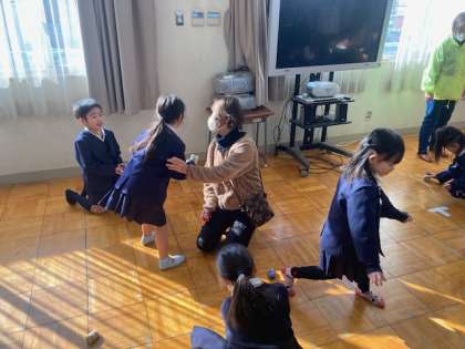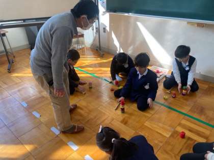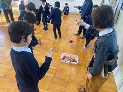 今日は地域のボランティアの方をゲストティーチャーとしてお招きし、1年生に昔あそびを教えていただきました。