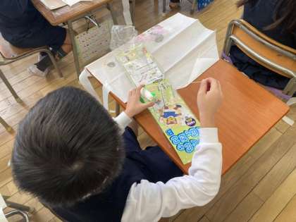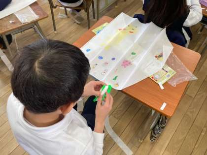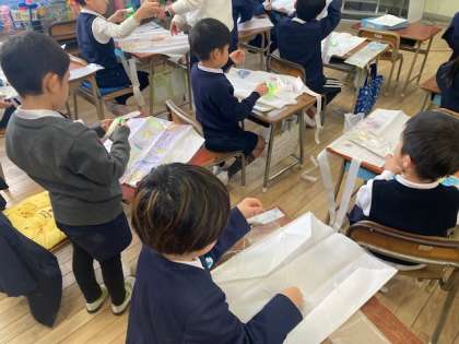 凧一面に好きなイラストを描いて色を塗っていきました!空高く舞い上がるか楽しみです(^^)