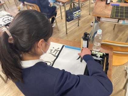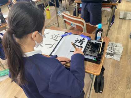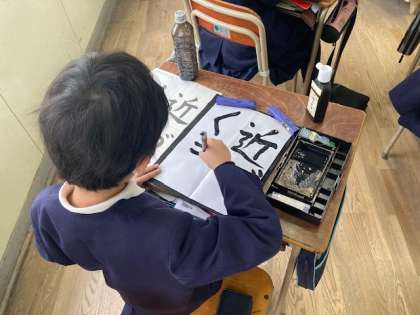 5年生が毛筆で「近づく春」という字を練習しました。良い姿勢で集中して取り組みました。