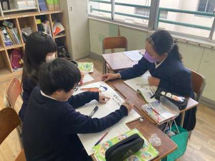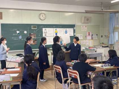 5年生が家庭科の学習で、季節や天候、活動に合わせて快適に過ごすための服装について考えました。グループで話し合い全体で発表しました。