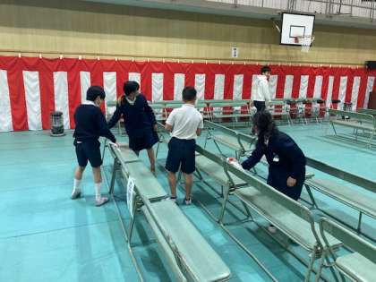 明日の卒業式に向けて、5年生の児童が教職員と一緒に準備をしました。