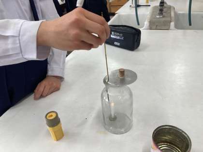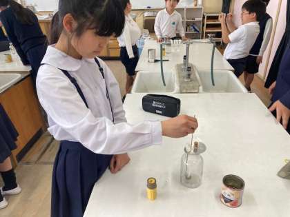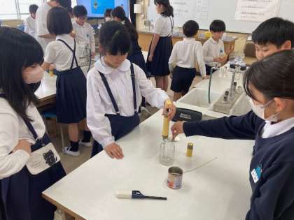 6年生が理科の学習で「ものが燃えるときの空気の変化」について調べました。ものを燃やす前と後の空気の成分のちがいを、気体検知管を使って調べました。