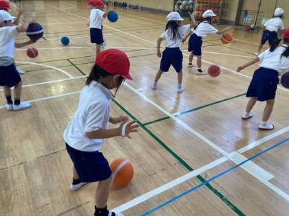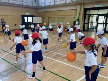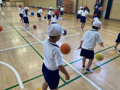 1年生が体育の時間にボールを使った運動を学習しました。しっかり足を踏ん張ってボールを同じ位置につけるように工夫しながら取り組みました。