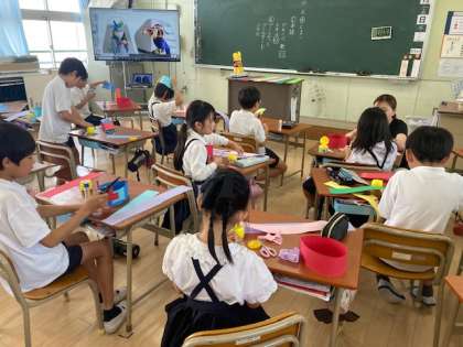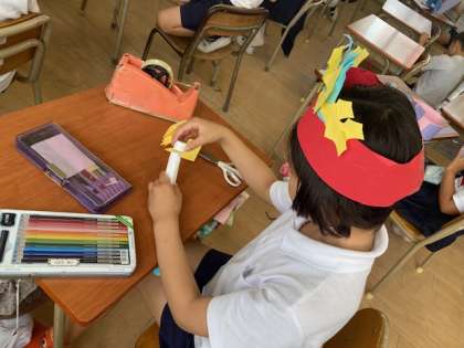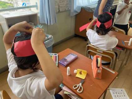 2年生が図工の時間に画用紙で輪を作り、思い浮かんだ飾りをつけ変身して楽しみました!