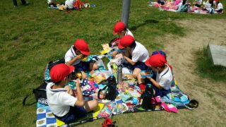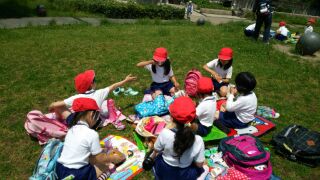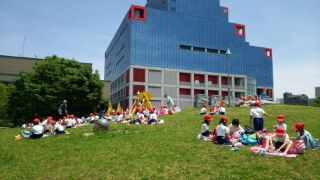 キッズプラザの見学を終え、青空の下でお弁当です。