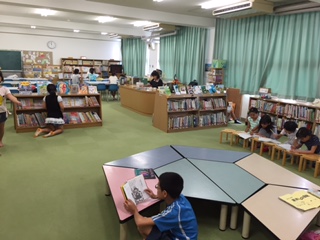 図書館開放。プールを待つ児童やプールを終えた児童が、図書の貸出や学習をしに来ています。