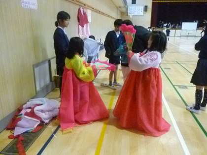 全学年が、となりの国、韓国・朝鮮の遊びをみんなでしました。また、楽器をたたいたり、衣装を体験したりもしました。