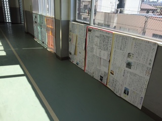 先日、6年生が5年生に向けて、平和学習で学んだことを新聞を使って伝えました。その新聞を、旧校舎から4年生の教室に向かう廊下に掲示し、自由に閲覧できるようにしています。