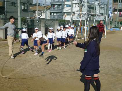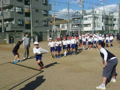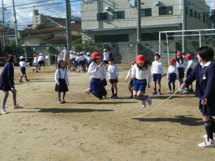 高学年児童が回す長縄を1・2年児童が跳びます。冬の体力づくりや縦割り活動の目的で行います。1月中に複数回20分休憩時に行っています。