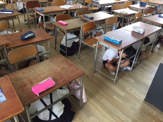 地震が発生したら、まずは机の下にもぐって、落下物から頭を守ります。